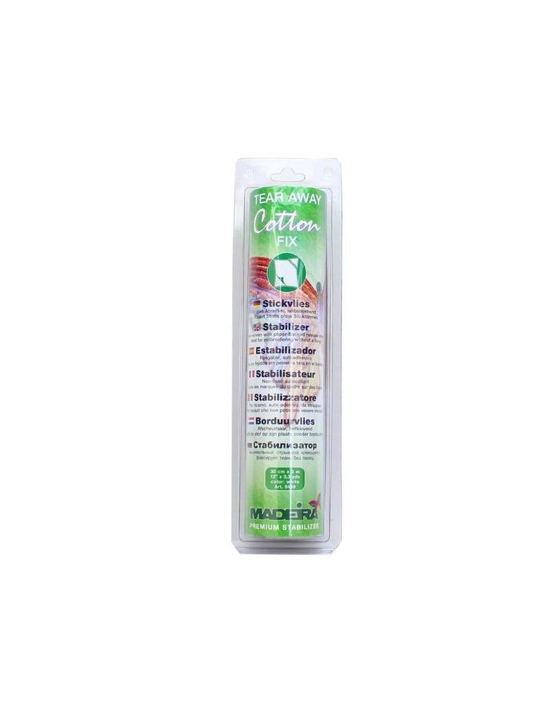 Cotton Fix - Stabilisateur - non-tissé à déchirer - autocollant - blanc 30cm x 3mCOTTON FIX est idéal pour broder à la machine. Avec COTTON FIX, la matière peut être fixée sans devoir être montée sur un cadre à broder, on évite ainsi les marques du cadre sur la matière. Egalement parfaitement adapté aux travaux de patchwork, les petits morceaux de tissus pouvant être positionnés et fixés comme on le souhaite.